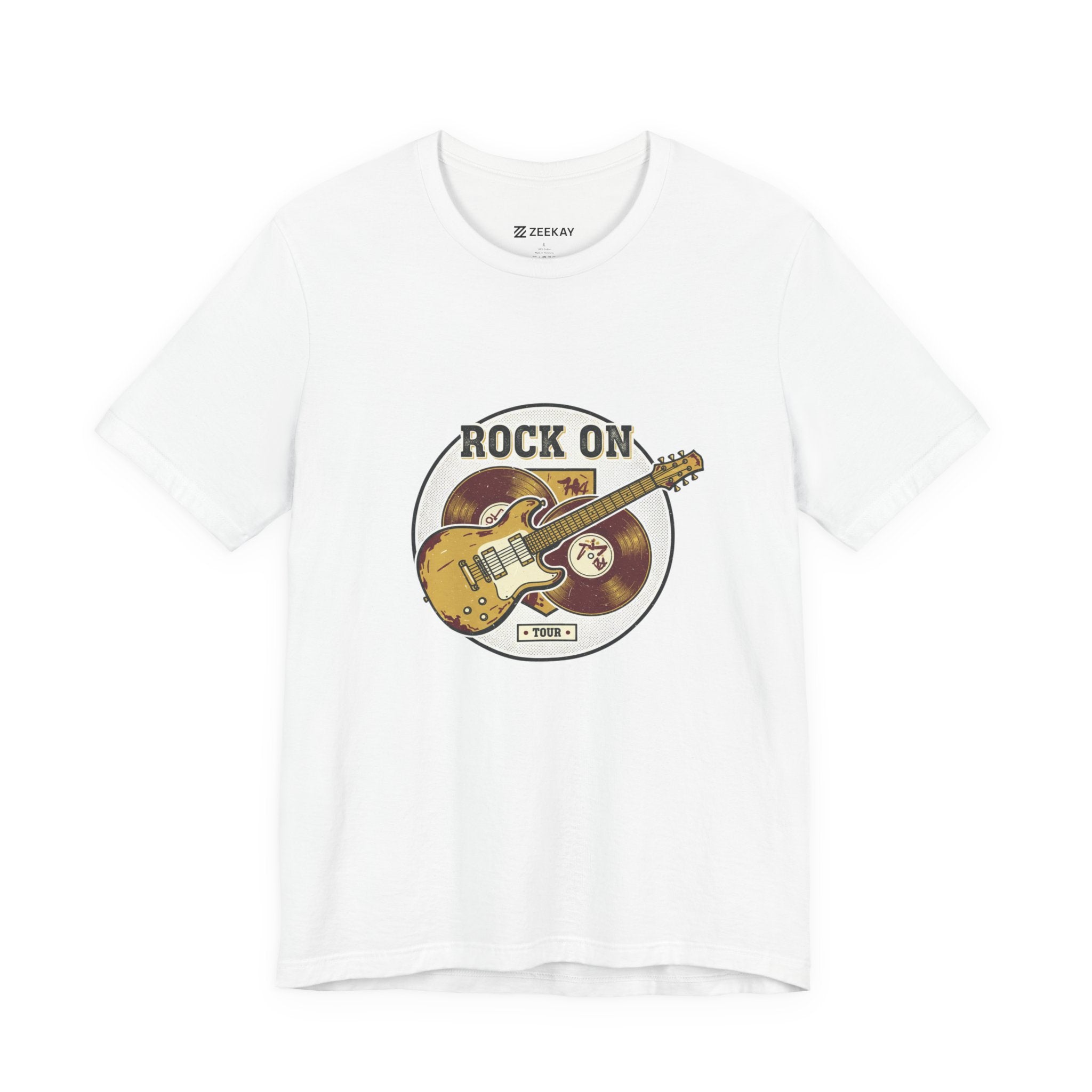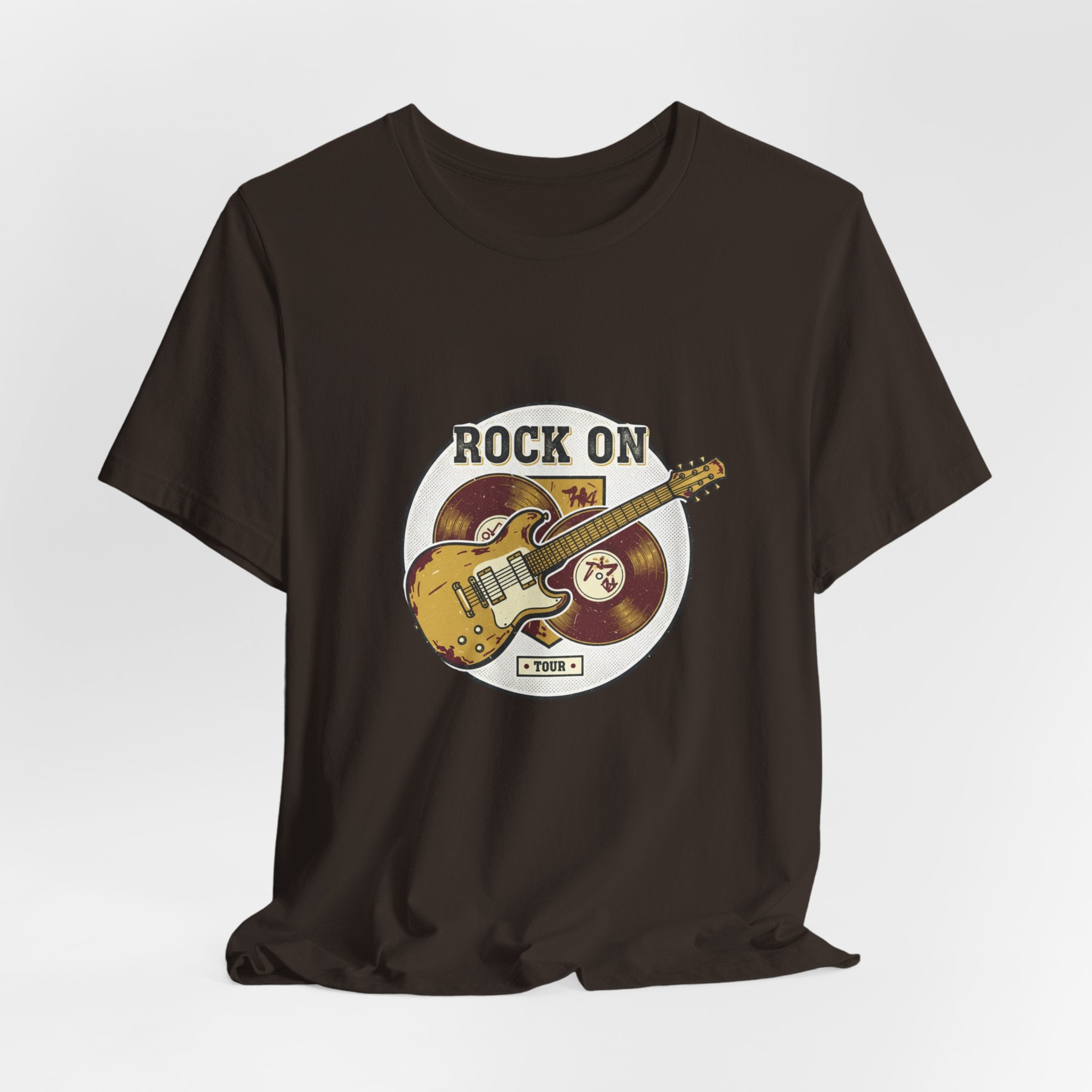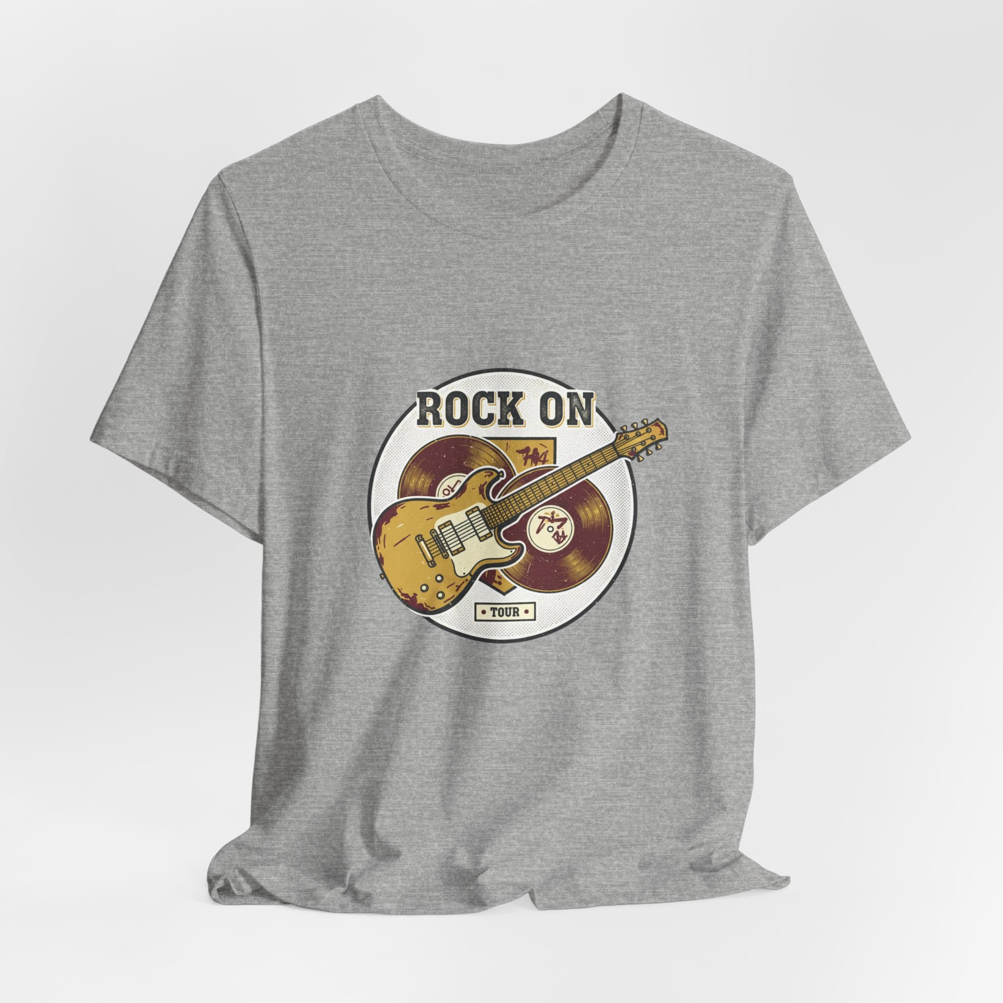 Vintage-inspired guitar crest printed in a faded, retro band-tee style that channels road-worn rock energy. The artwork shows a distressed electric guitar over stacked vinyl records with arched text and muted colors for an authentic, analog-nostalgia look suited to the retro band/rock graphics trend. Subtle distressing and serif-style lettering give it a worn concert-tee vibe that pairs with layered casual outfits and music-focused wardrobes.