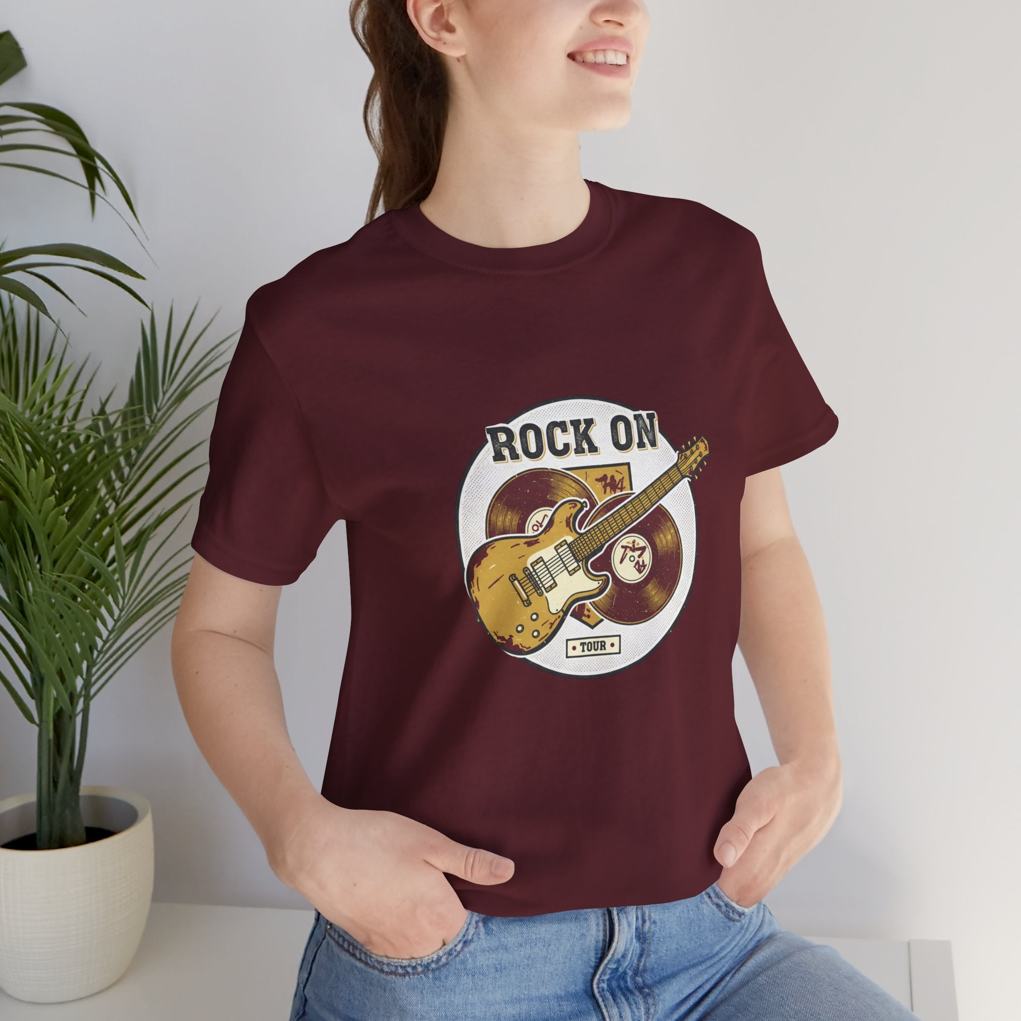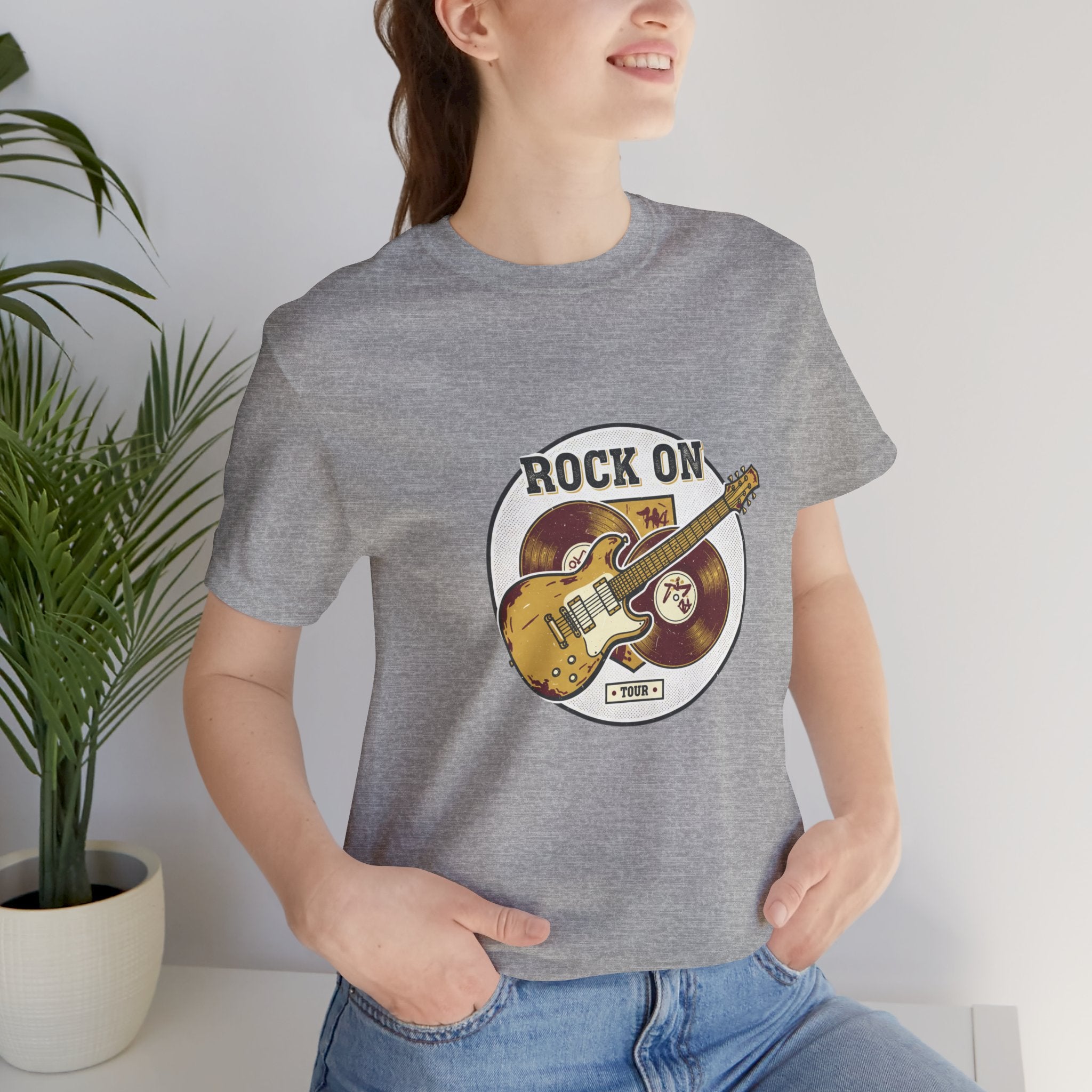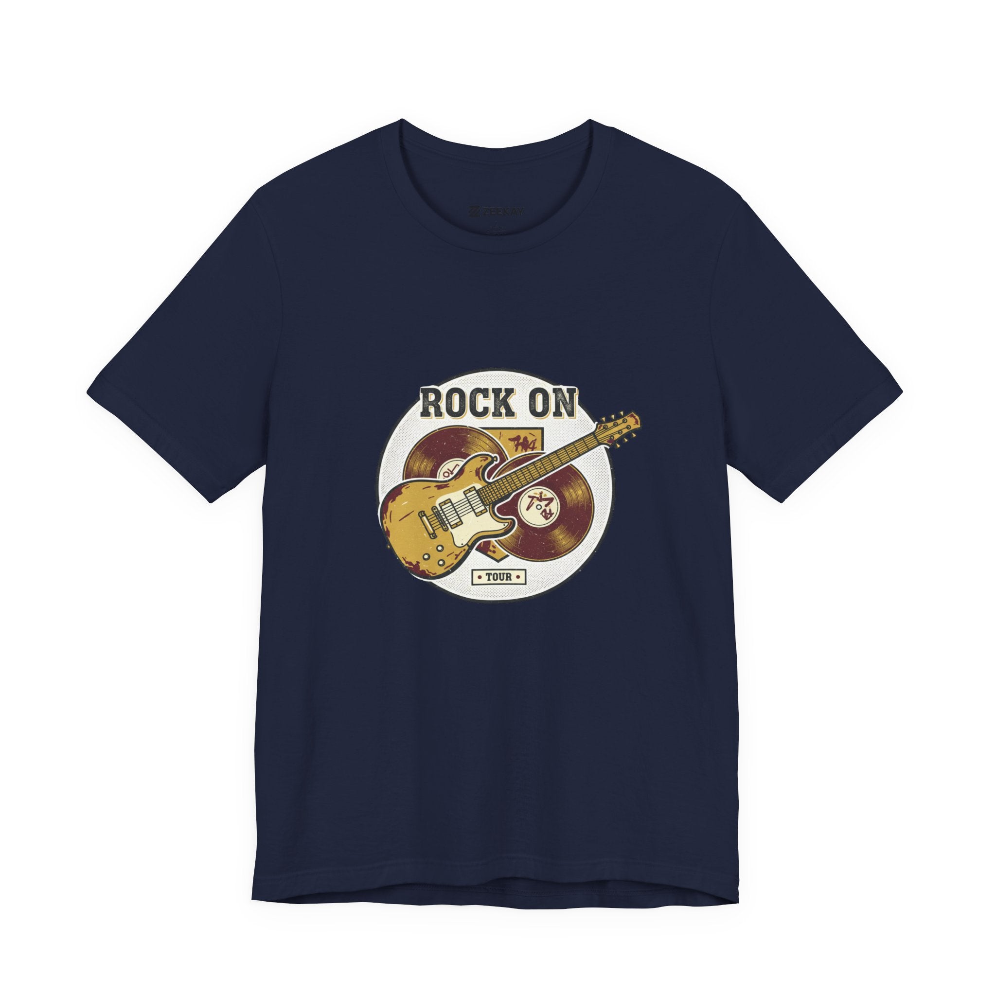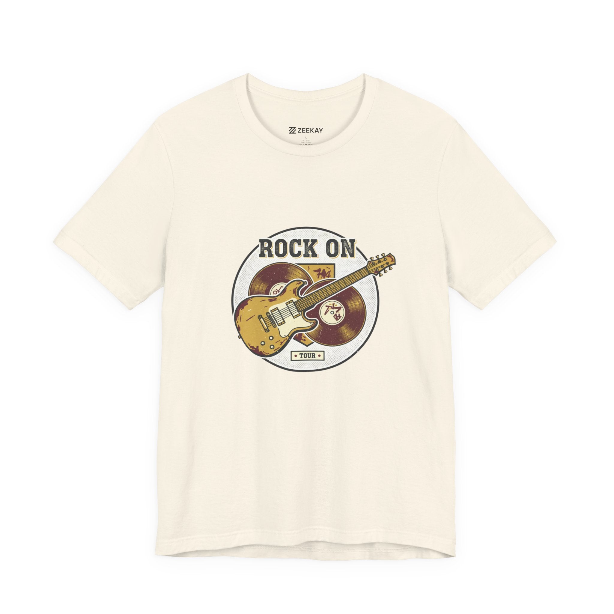 Vintage-inspired guitar crest printed in a faded, retro band-tee style that channels road-worn rock energy. The artwork shows a distressed electric guitar over stacked vinyl records with arched text and muted colors for an authentic, analog-nostalgia look suited to the retro band/rock graphics trend. Subtle distressing and serif-style lettering give it a worn concert-tee vibe that pairs with layered casual outfits and music-focused wardrobes.